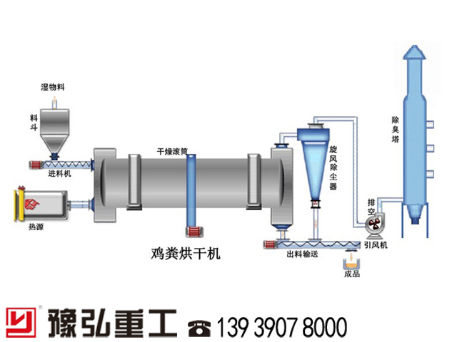 雞糞烘干機(jī)主要由供熱源、上料機(jī)、進(jìn)料機(jī)、回轉(zhuǎn)滾筒、物料破碎裝置、出料機(jī)、引風(fēng)機(jī)、卸料器和配電柜構(gòu)成;脫水后的濕物料加入干燥機(jī)后,在滾筒內(nèi)均布的抄板器翻動下,物料在干燥機(jī)內(nèi)均勻分散與熱空氣充分接觸,加快了干燥傳熱﹑傳質(zhì)。在干燥過程中,物料在帶有傾斜度的抄板和熱氣質(zhì)的作用下,至干燥機(jī)另一段星形卸料閥排出成品。